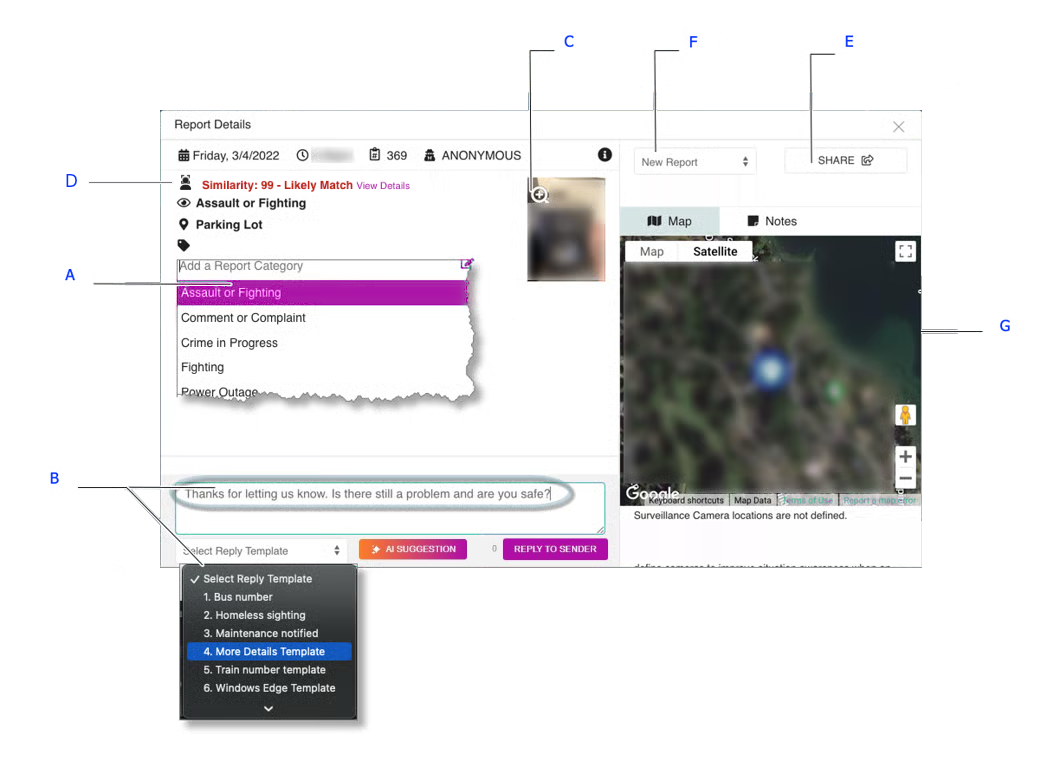 The date, time. and the user’s contact information is displayed at the top (C). In the example above, the user chose to remain anonymous. A description of the reported issue, Report Type (Assault or Fighting), the location (Parking Lot), photo, and a location map are displayed (D). A Report may also have a video attached.