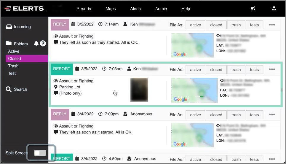 The Operator can view Report details as a split screen. By default, the Split Screen button is in the off position at the bottom of the folders panel: