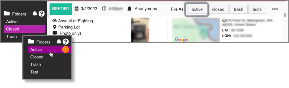 Once a Report is placed into a folder, you can later reclassify its status. For example, you can move an Active report to the Closed folder. Conversely, if a Report that has been Closed and needs to be re-examined, select it and change it to Active:
