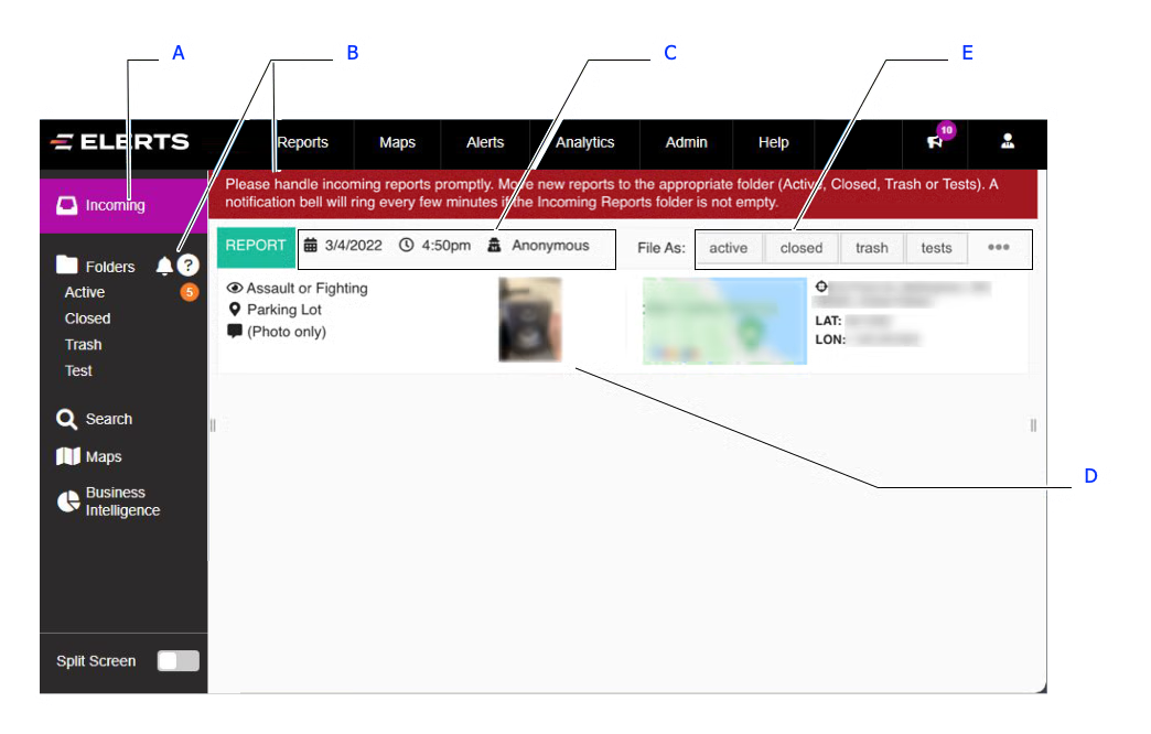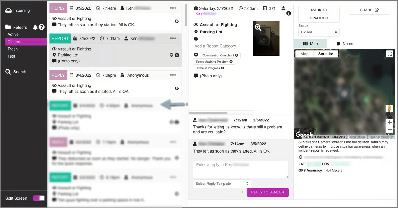 The Console receives an Incoming Report submitted by a user in real-time. There are generally three steps to properly handle an Incoming Report. You’ll (1) view the detailed Report information, (2) communicate with the user, and (3) close out the Report as being handled: