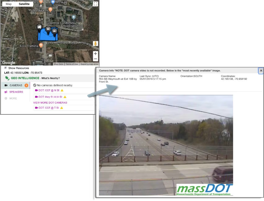 Click Hybrid to view a topology view, Heat Map to show accumulated trends, and Show Resources highlighting the location of defined Resources such as CCTV cameras. This is what a hybrid view looks like: