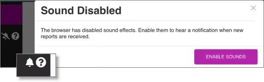 Console depends on playing a sound pattern for Incoming report notifications. If at any time, sound becomes disabled, you’ll be asked to re-enable audio sound. Click ENABLE SOUND and the sound symbol with a line through it will change to a solid symbol: