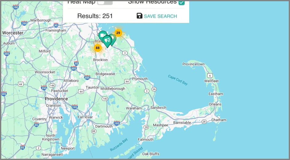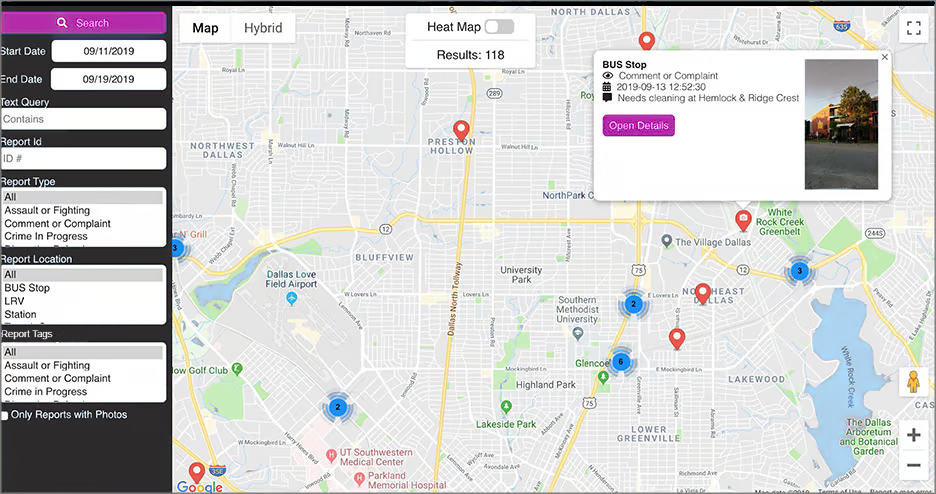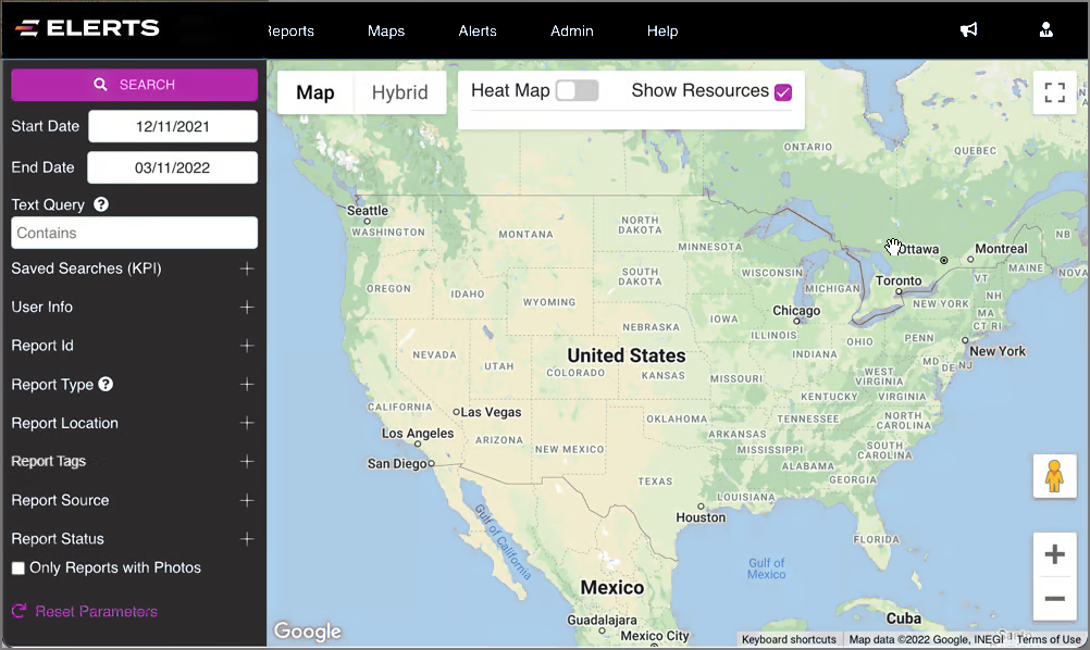 To start off, choose a date range and press SEARCH. The map will be displayed with pins indicating the location for submitted incident Reports.