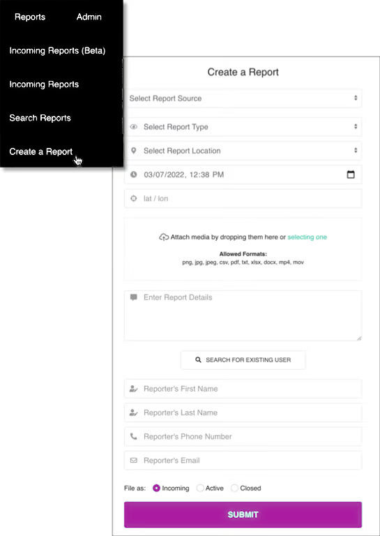 Include any Report details and identify the user by either searching through the users or by entering the reporter’s contact information. Select the status as either incoming, active, or closed. Once you have completed the form, click SUBMIT.