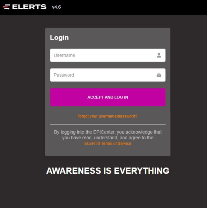 To log in to the Console, browse to your EPICenter login web page (starts with https://console.elerts.com/login/…) Some organizations have operators log into the Console with Single Sign On (SSO). For others, enter your username or password. Click the ACCEPT AND LOG IN button: