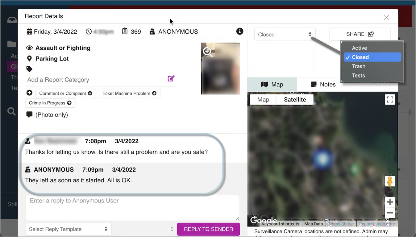 By maximizing the Console screen, you’ll have access to more features: communicate with the user, change Report status, add notes, attach Report Tags, zoom in on photos and map, mark the sender as a Spammer, or share the Report by email.
