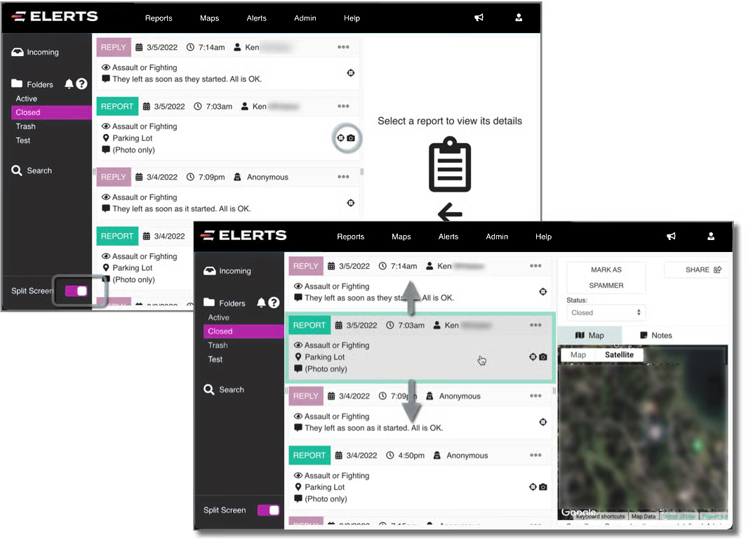 Click the Split Screen button to the on position. The Report list is compressed, leaving room to the right. Small symbols (circled below) identify if a GPS location or photo is included in the Report. Click on a Report, and its details are displayed to the right: