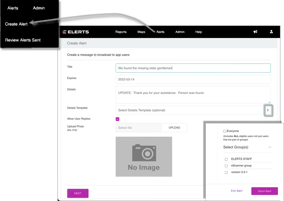 Press NEXT and select who will receive the alert before clicking the Send Alert button. In this example, the operator will broadcast the alert to the group named ELERTS STAFF.