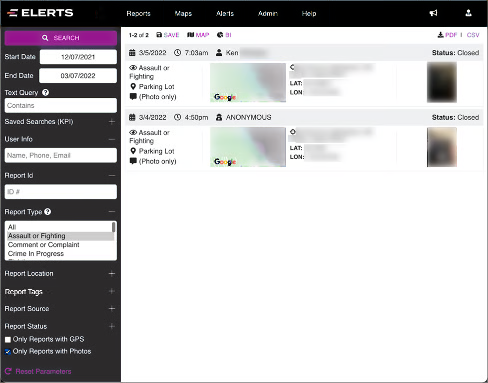 Using the same search criteria you just learned about in “Searching reports,” you can also view the results visually by clicking on Maps in the menu bar: