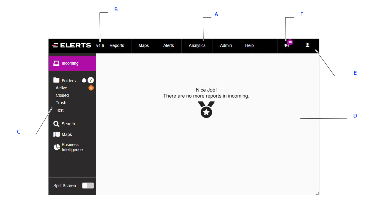 A blinking alert symbol and the number of Incoming reports will appear on top of the Incoming tray (A) above the folders panel. In this example, a single Incoming Report has been received.